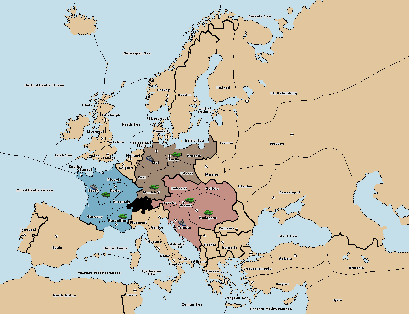The standard Diplomacy map of Europe, but only France, Germany and Austria.
