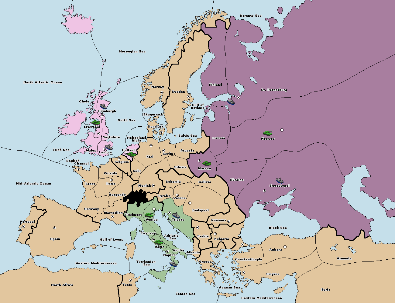 The standard Diplomacy map of Europe, but with Russia, England and Italy as the only playable countries. To offset the balance of Russia's four builds, England gians Holland as a home suppply center while Italy gains trieste - each for based on historical links.