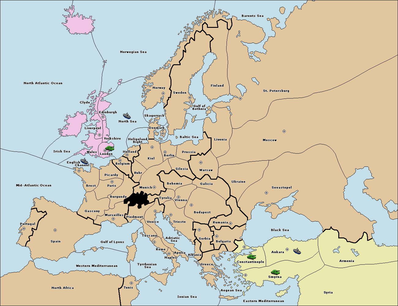 The standard Diplomacy map of Europe, but with England and Turkey as the only playable countries. To offset the imbalance of Englands start, his fleets now start in open seas